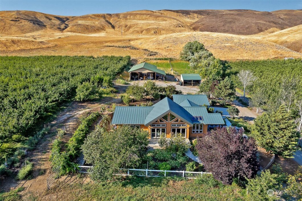Custom Built Post & Beam with immaculate design & Private Equestrian Acreage. This home boasts vaulted ceilings, exposed beams, custom cherry cabinetry, engineered hardwood, travertine tile, main suite with vaulted ceilings, 5 piece bath, clawfoot tub, and french doors to patio overlooking the pasture and cherry orchard beyond. Guest rm has access to full bath; office provides ample space for home office. Walk out from spacious utility room to X-large 2 car garage. Mature landscape two shares of irrigation for ample water; three pastures, garden space, and lawn. Barn boasts 4 stalls & outlets for each stall, washing station, tack room, turn outs directly to paddocks & large detached Hay Shed. Close to amenities yet peaceful quiet location!