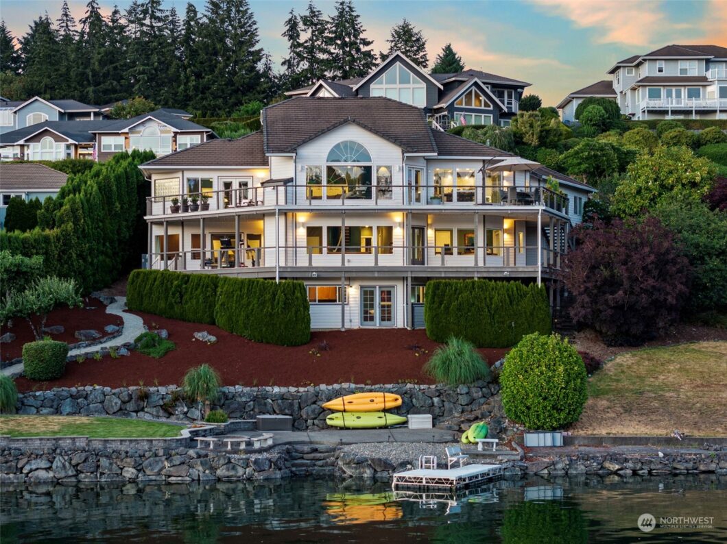 Experience the epitome of waterfront living on the coveted shores of Wollochet Bay: where Gig Harbor comes to play! This extraordinary property features 90 feet of prime west-facing low bank waterfront with bulkhead and community dock. An entertainer’s dream; enter into soaring ceilings, a grand living room and spacious kitchen with sweeping bay views. Enjoy the breathtaking vistas and epic sunsets from the two wrap-around decks. Home offers 4 bedrooms, including a luxurious primary suite w/ large ensuite bathroom and oversized walk-in closet. Additional amenities include an in-home theater, sauna and two additional office spaces. Daylight basement serves as a separate apartment with a kitchen, 3/4 bath and ample living space. Welcome home!